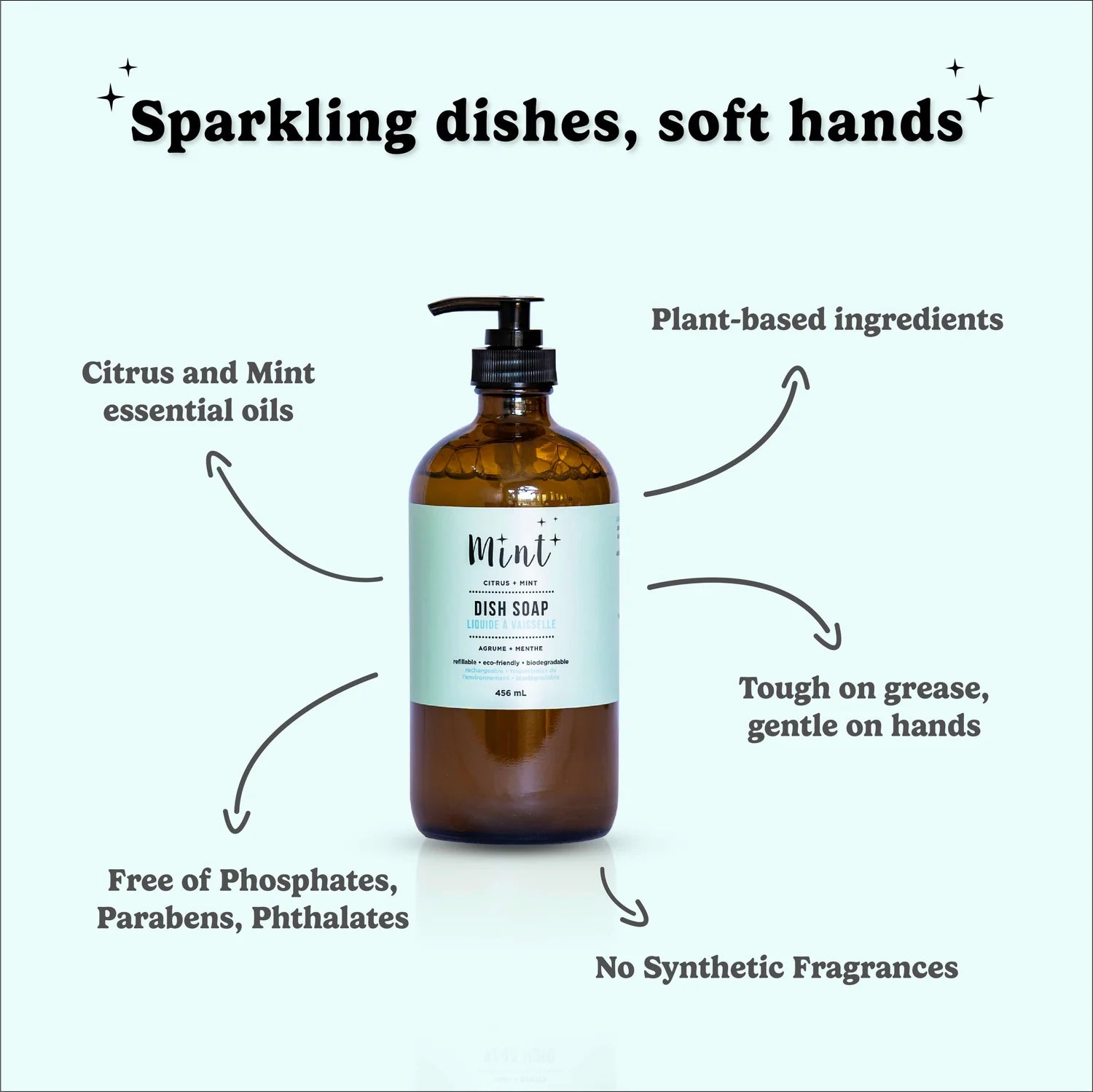 Mint Dish Soap is a natural, biodegradable solution that’s tough on grease yet gentle on hands. Strong enough to handle pots and pans but mild enough for everyday handwashing. Infused with Citrus and Mint essential oils for a refreshing scent, it leaves dishes sparkling clean without drying out your skin. Available in a 456ml refillable bottle, helping you make sustainable choices without compromising effectiveness.