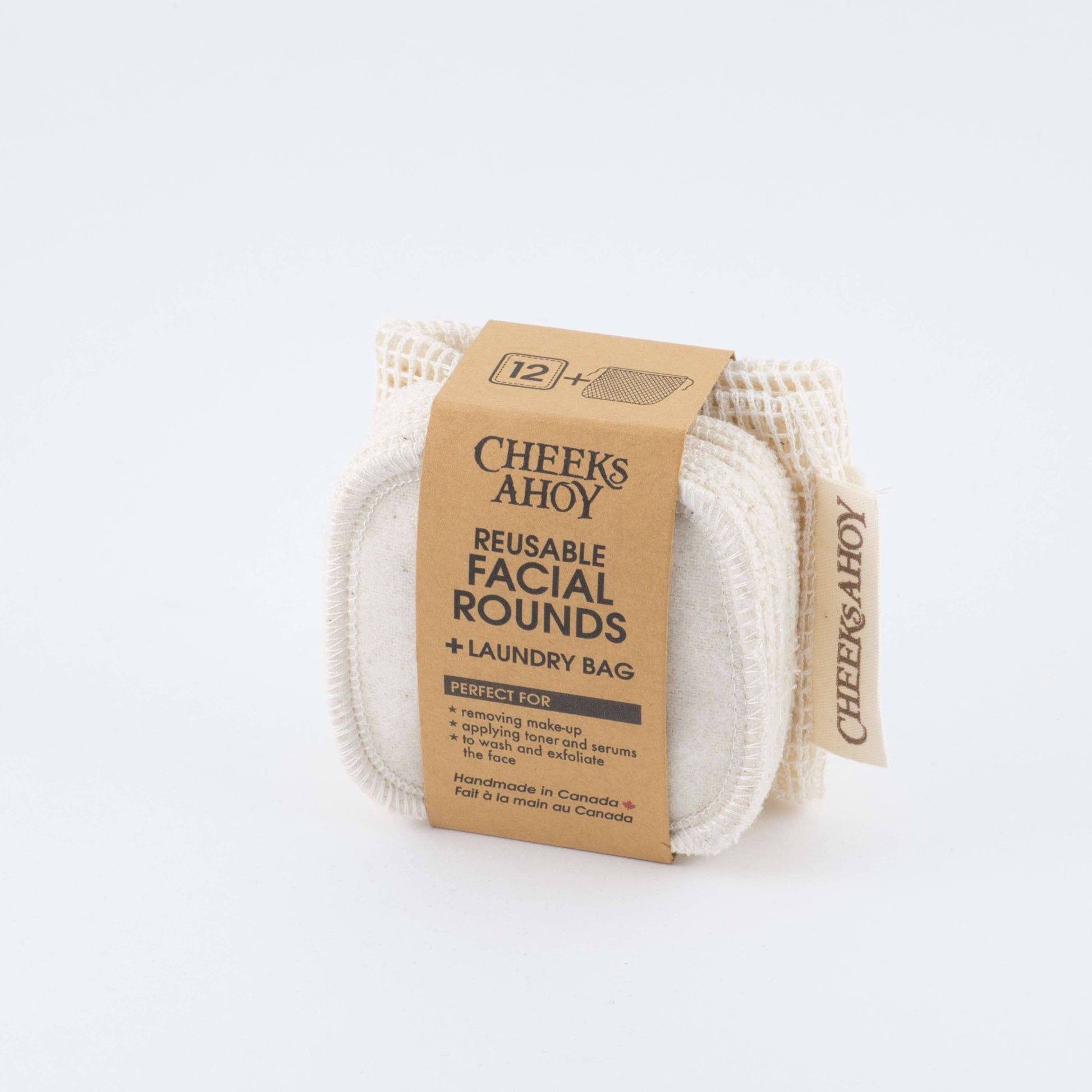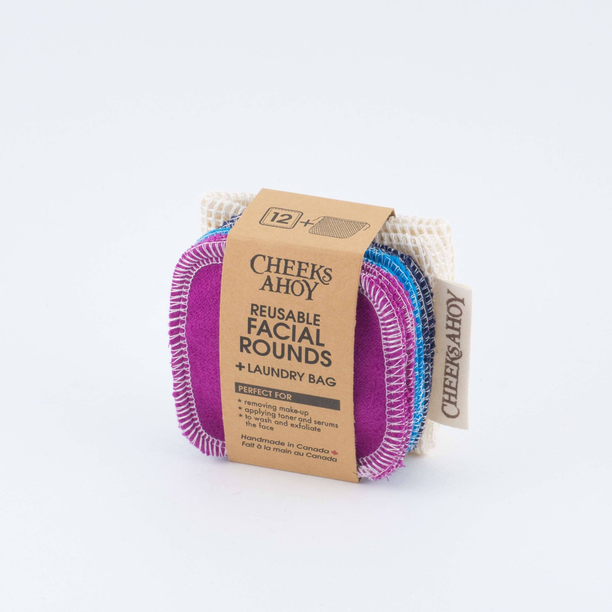 Each set of 12 reusable facial rounds is 2-ply and approximately 3 inches in diameter, providing excellent absorbency and comfort. Included is a 100% organic cotton laundry bag (10" x 9") for easy washing and storage.