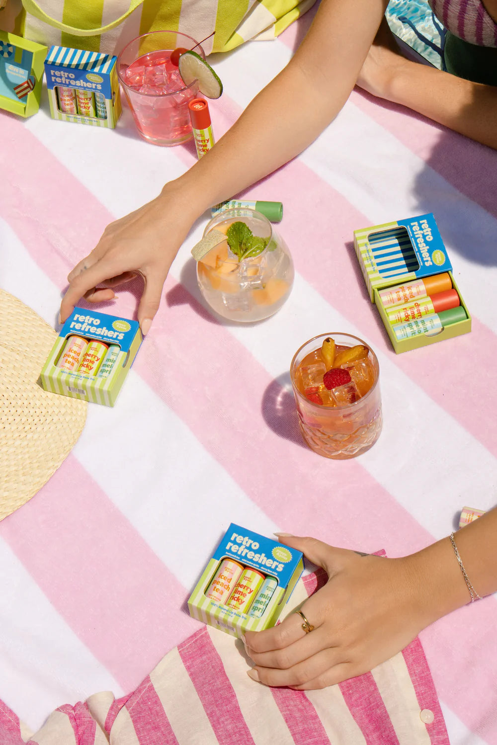 Meet the Retro Refreshers Lip Balm Trio! This gift set is the ultimate summer accessory, bringing the refreshing vibes of poolside fun and cool summer drinks straight to your lips. This vibrant set features three lip balms inspired by the bright, fruity flavours of classic summer beverages.