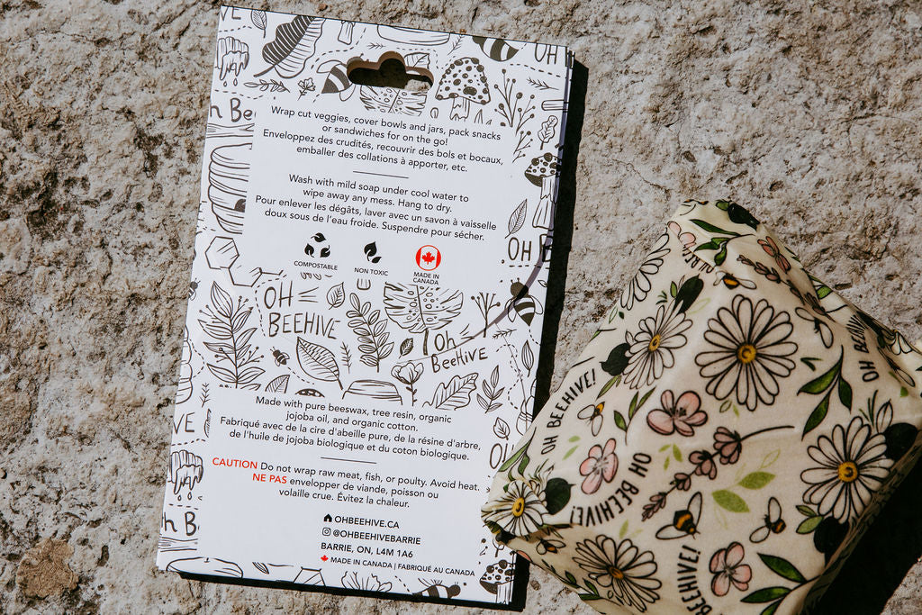 Each wrap is handmade in Canada using 100% cotton, Canadian beeswax, tree resin, and jojoba oil. Naturally antibacterial and breathable, they help keep food fresher for longer without waste.
